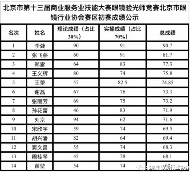 北京市第十三届商业服务业技能大赛眼镜验光师竞赛北京市眼镜行业协会赛区初赛参赛单位、参赛选手: 北京市第十三届商业服务业技能大赛眼镜验光师竞赛北京市眼镜行业协会赛区初赛(以下简称“本赛区初赛”)于2023年5月31日在海淀区远大路19号举行,实际参加比赛的选手为28人,考场所在属地海淀区职业技能鉴定管理中心派员全程督导了比赛,现将本赛区初赛排名前50%选手成绩公示如下: